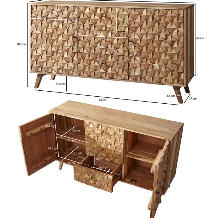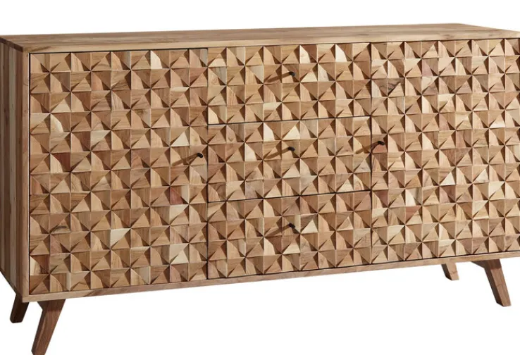 Mit dem in brauner Farbe gehaltenen Sideboard welches die Maße 140 x 78,5 cm aufweist, entscheidet man sich für ein Möbel, das mit seinem Aussehen begeistert und zudem äußerst praktisch ist. Dieses Sideboard aus massivem Akazienholz hat eine Tiefe von 40 cm. Dank seines Designs ist es ein absoluter Hingucker in jedem Raum und weiß darüber hinaus auch mit seiner Funktionalität zu begeistern. So verfügt es über zwei Drehtüren sowie drei Schubkästen. Dadurch ist es nicht nur ein Stauraum, mit dem es leicht fällt, Ordnung im Zimmer zu halten, sondern die Sachen lassen sich auch innerhalb des Möbels unterteilen.