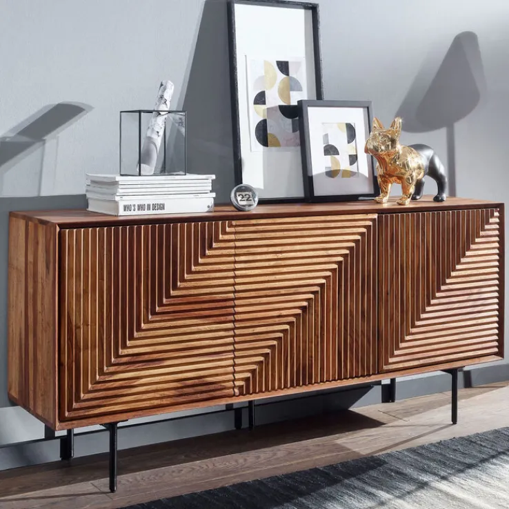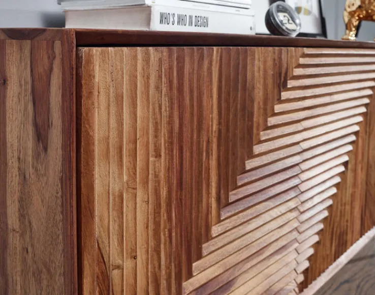 Das massive Sideboard mit den Maßen 148 x 72 cm ist ein atemberaubendes Möbelstück aus Sheesham, das nicht nur mit einer dekorativen Optik, sondern auch mit viel Stauraum überzeugt. Faszinierend sind vor allem die 3D-Oberflächen mit schönem Muster. Es ist ein Sideboard, dass sich hervorragend in einem Wohnzimmer oder einem großen Flur macht. Die Vorderseite des Möbels ist mit tiefen Rillen versehen, die in zwei Richtungen führen und dadurch einen attraktiven Effekt mit Licht- und Schattenspiel bieten. Hinter den Türen verbergen sich insgesamt vier große Fächer, in denen Bücher, Dekoration und andere Lieblingsdinge untergebracht werden können.