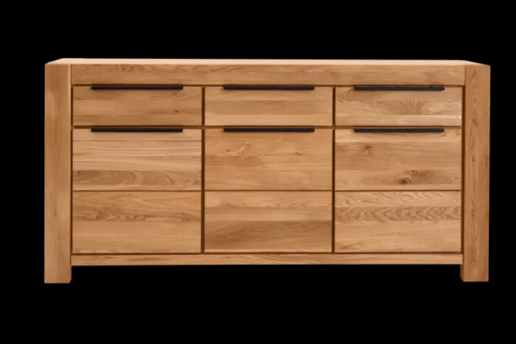 Gefertigt aus hochwertigem Holz und Metall, bietet das Sideboard drei Türen, drei Schubkästen und drei Einlegeböden, die ausreichend Platz für die Organisation von Gegenständen bieten. Die Soft-Close-Funktion sorgt für ein geräuschloses Schließen der Türen und Schubladen, während die schwarzen Griffe einen stilvollen Kontrast zur natürlichen Holzmaserung bilden. Dieses Möbelstück vereint Funktionalität und Ästhetik und ist eine ideale Ergänzung für jedes Zuhause.