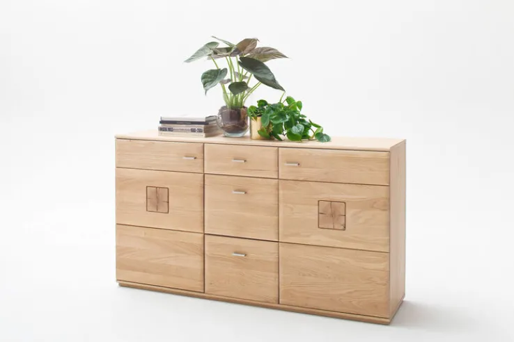 Das Sideboard punktet mit einem zeitlos eleganten Design, welches von teilmassivem Eichenholz mit natürlicher Holzstruktur unterstrichen wird. Hinter zwei gedämpften Türen und in drei Schubladen lassen sich leicht Geschirr, Tischwäsche, die Hausbar oder was immer Ihnen wichtig ist verstauen. Das Sideboard eignet sich nicht nur für das Wohn- oder Esszimmer, sondern Sie können es beispielsweise auch im Schlafzimmer als Kommode verwenden. Mit seiner warmen Holzoptik sorgt das teilmassive Sideboard in Eiche bianco in Ihrem Zuhause für eine gemütliche Wohnatmosphäre.