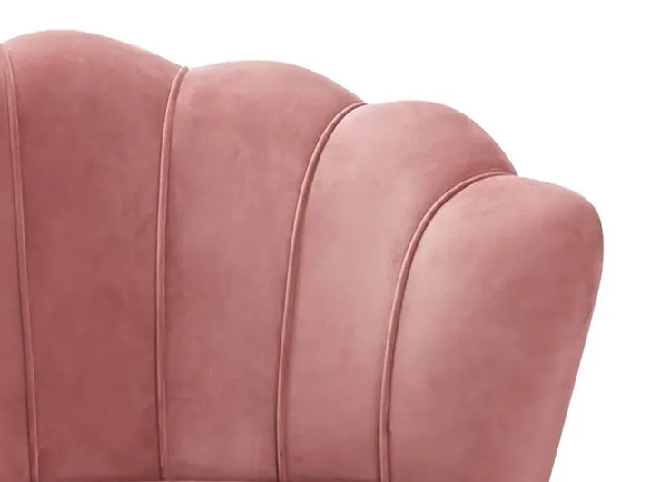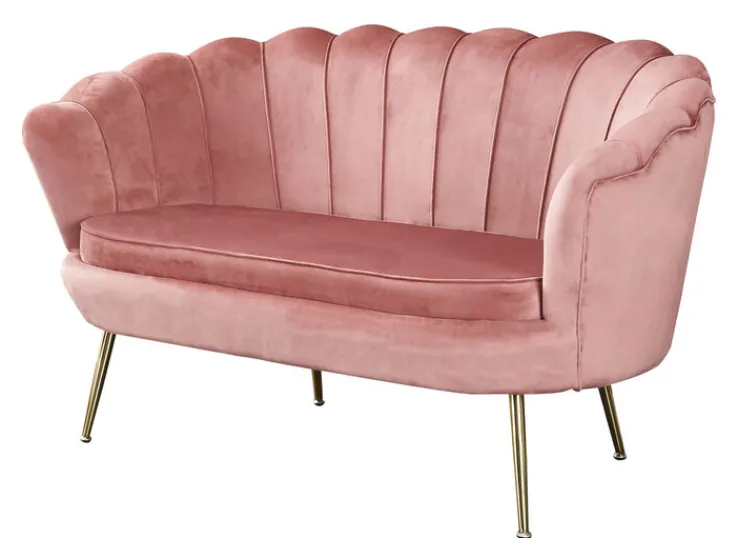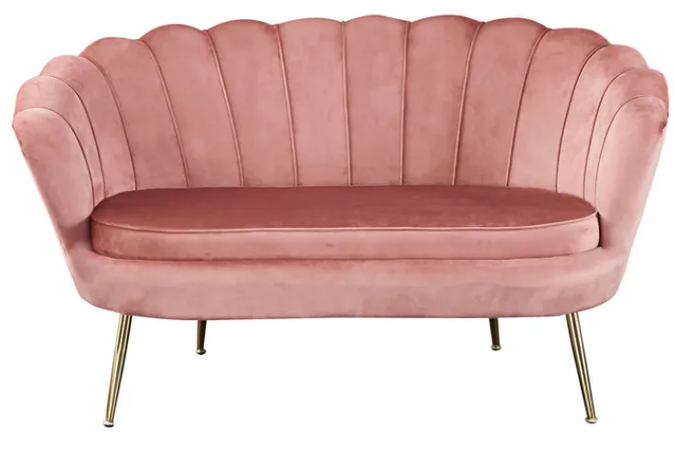 Der 2-Sitzer benötigt eine Stellfläche von 136 x 77 cm. Sein goldfarbiges Vierfußgestell aus Chrom vereint er mit einem abgerundeten Sitz- und Rückenbereich mit Samtbezug. Durch die Kombination von samtiger Oberfläche, erhöhtem Sitzpolster und abgerundeter Form schmiegt sich das Sofa förmlich an den Körper an und begeistert Familie und Gäste mit einem hohen Komfortgefühl. Das Highlight der Couch ist jedoch ihr extravaganter Muschellook, der an vergangene Tage erinnert.