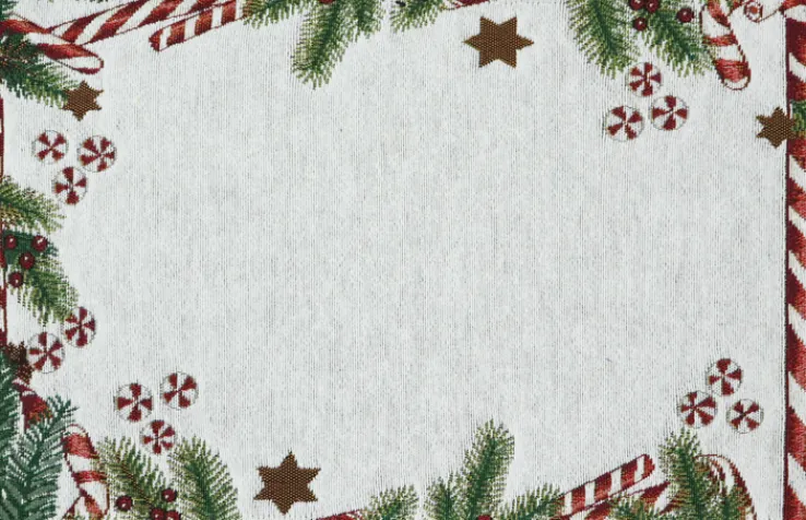 Das Design des Sets ist mehrfarbig, mit einem dominierenden Beige-Bunt-Farbton, der eine warme und einladende Atmosphäre schafft. Die Oberfläche ist mit weihnachtlichen Motiven wie Zuckerstangen, Tannenzweigen und Sternen verziert, die in Rot, Grün und Braun gehalten sind. Diese Details verleihen dem Set eine festliche Note und machen es ideal für die Weihnachtszeit. Die hochwertige Verarbeitung und die Verwendung von Naturmaterialien unterstreichen die Qualität und Langlebigkeit des Produkts.