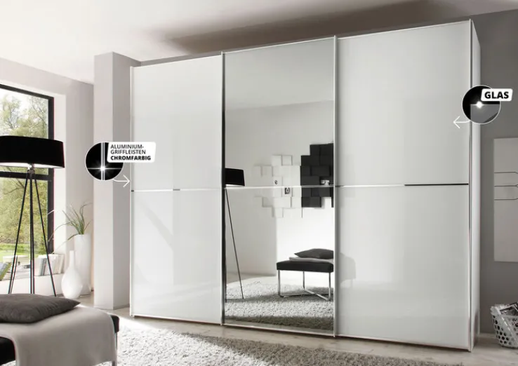 Der 3-türige Kleiderschrank SINFONIE PLUS VIII von STAUD in der Farbe alpinweiß hat ein zeitloses Design. Durch seine Fronten mit einem Spiegel in der Mitte, Türen mit Alpinweißglas sowie chromfarbigen Griff- und Zierleisten passt der Schwebetürenschrank mit einer Breite von 280 cm in das modern eingerichtete Schlafzimmer. Der intelligent unterteilte Innenraum mit sechs Fachböden und drei Kleiderstangen bietet viel Platz und Stauraum für Wäsche und Kleidung.