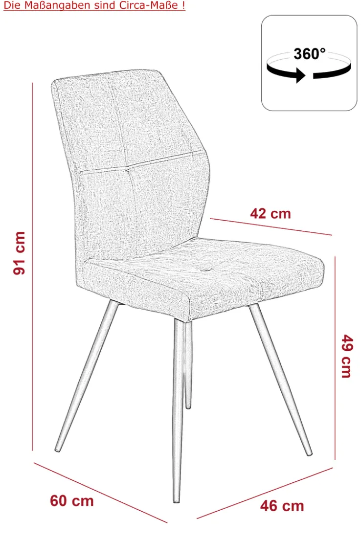 Breite: 46 cmHöhe: 91 cmTiefe/Ausladung: 60 cmLänge: 60 cmGewicht: 6,2 kgSitzbreite: 46 cmSitztiefe: 42 cmSitzhöhe: 49 cmmaximale Belastbarkeit: 120 kgHöhe Rückenlehne: 42 cm