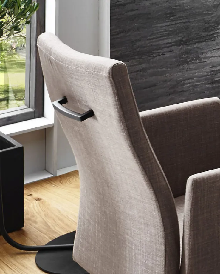 Der Stuhl präsentiert sich in einem ansprechenden Khaki-Farbton, der sich harmonisch in verschiedene Wohnstile einfügt. Der Bezug aus Textil verleiht dem Stuhl eine angenehme Haptik und sorgt für zusätzlichen Komfort. Das Gestell aus Metall in Schwarz bietet Stabilität und unterstreicht das moderne Erscheinungsbild des Schwingstuhls. Die Armlehnen und die ergonomische Form des Stuhls tragen zu einem hohen Sitzkomfort bei, ideal für lange Abende am Esstisch.