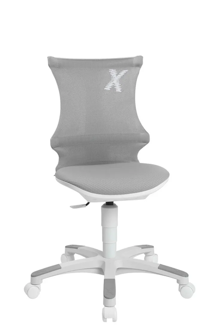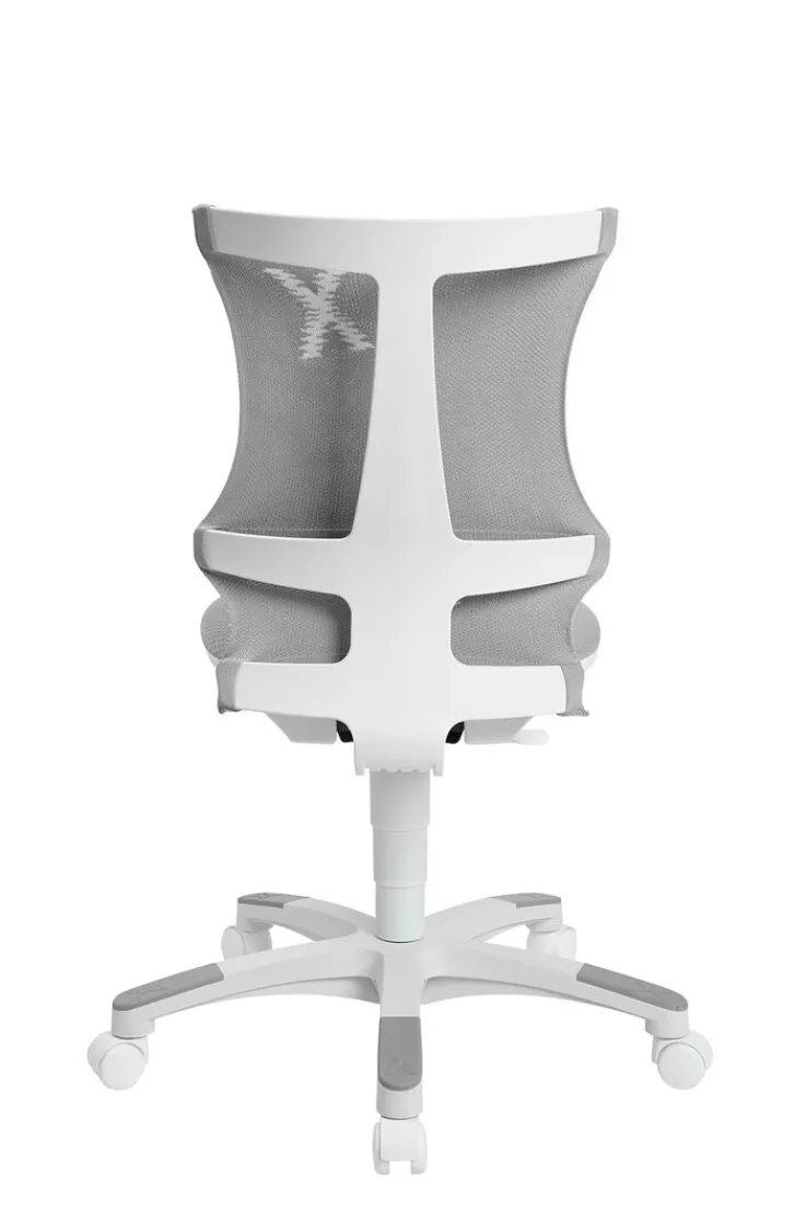 Der drehbare Stuhl mit der außergewöhnlichen Rückenlehne passt sich jeder Bewegung an. Der atmungsaktive Netzbezug der Lehne besteht aus grauen Synthetikfasern (Polyester), der gepolsterte Sitz mit dem feinen Design sorgt für hohen Komfort. So kann der Nachwuchs in Ruhe arbeiten und fühlt sich auch bei längerem Sitzen wohl. Das weiße Stuhlgestell besitzt fünf stabile Arme mit leicht beweglichen Doppelrollen. Er ist zudem auf Sicherheit geprüft und für Kinder zwischen fünf und 13 Jahren geeignet.