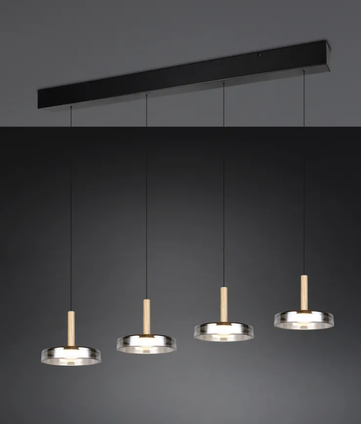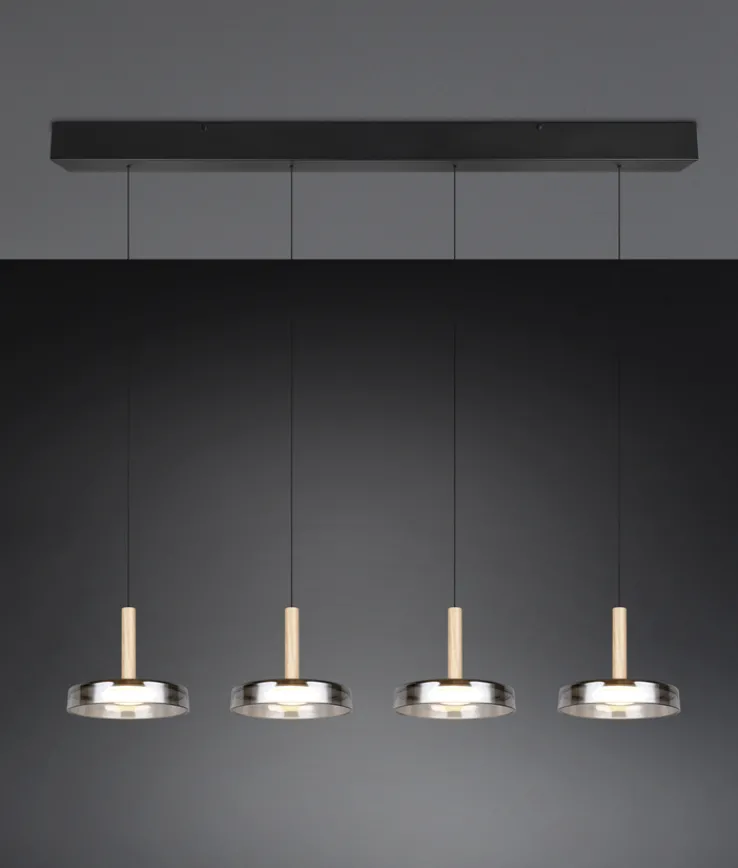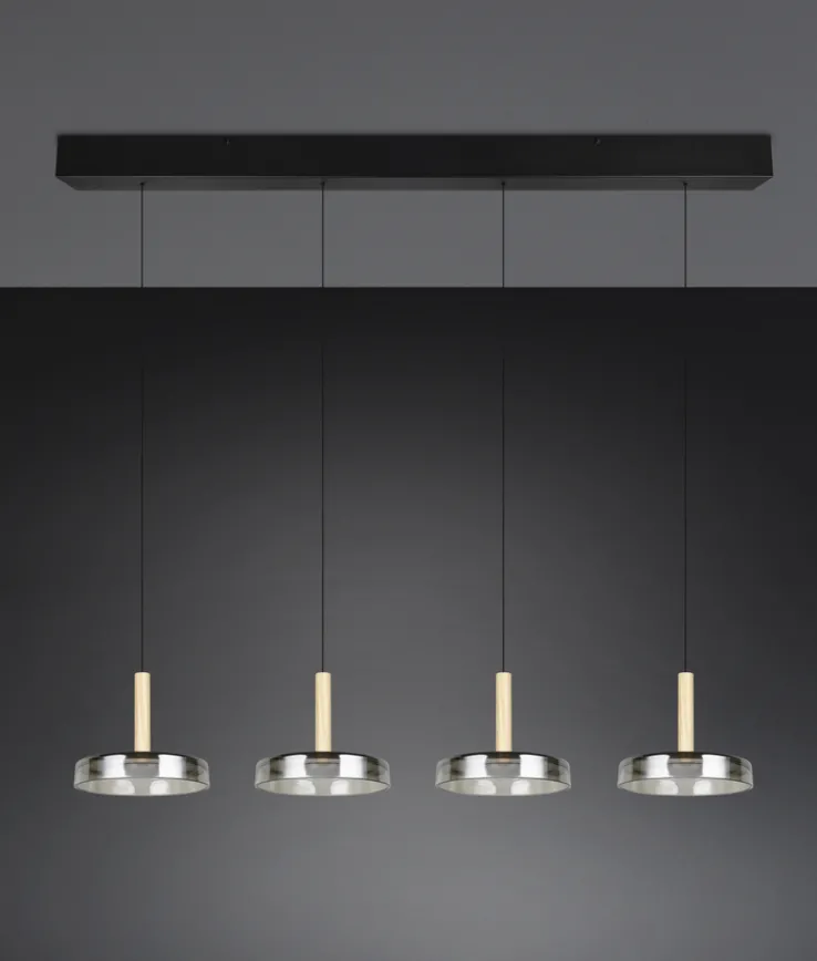 Stilvoll linealisch reihen sich die Hängeleuchten der 4-flg. CELESTE LED Balkenpendel aus schwarzem Metall und Rauchglas elegant nebeneinander. Durch ihre Lift-me- sowie Switchmo-Technologien lässt sie sich bequem in ihrer Höhe verstellen und ihrer Lichtintensität in drei unterschiedliche Stufen dimmen.