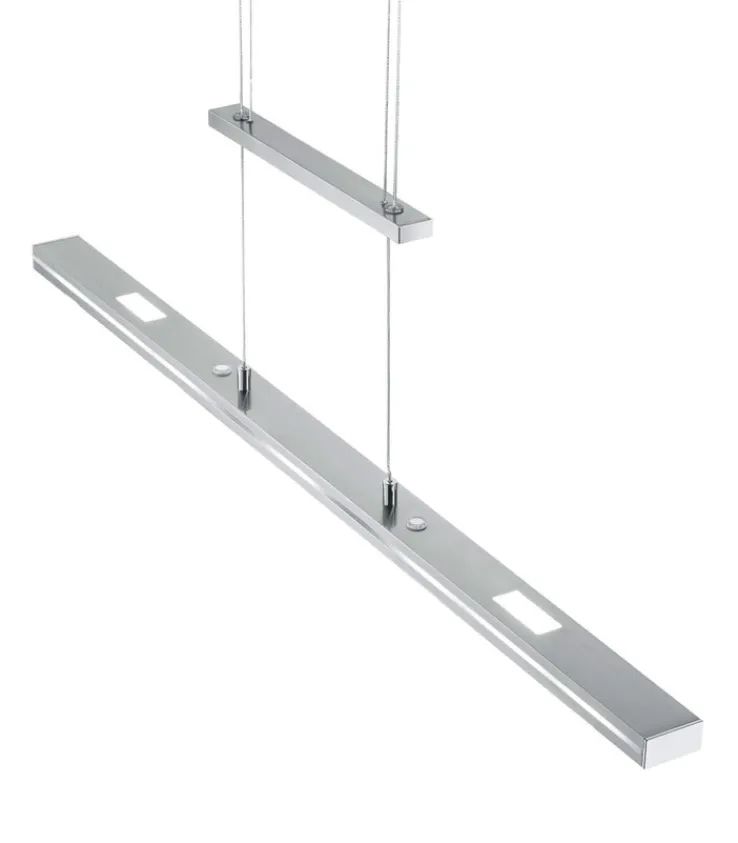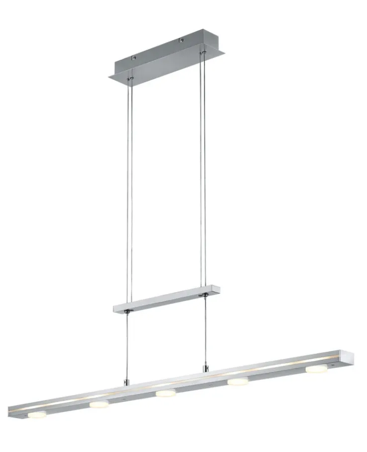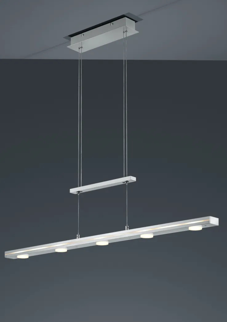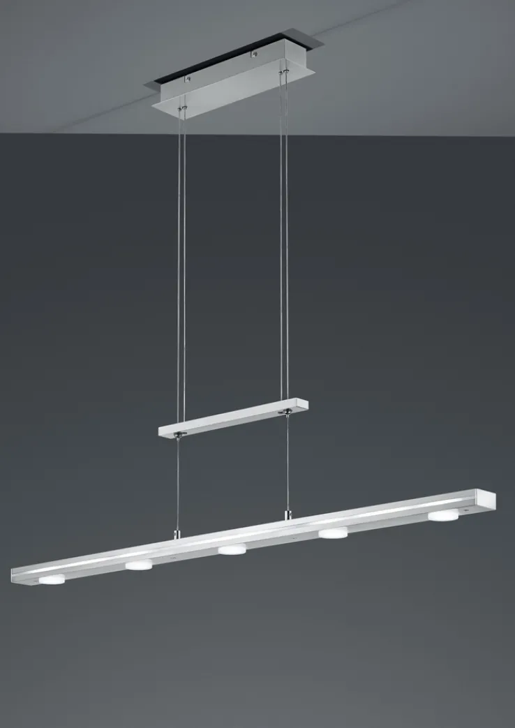 Die Pendellampe ist an zwei Seilen befestigt. Sie hat eine rechteckige Form und besteht aus robustem Metall. Außerdem lässt sich die Lampe in der Höhe verstellen und ist mit fünf kreisrunden Flammen ausgestattet. Die notwendigen LED-Leuchtmittel befinden sich bereits in der Lampe und bietet gemeinsam eine Lichtleistung von 2660 lm und eine Farbtemperatur von 5000 K. Die Brenndauer liegt bei ca. 30.000 Stunden. Die Lichtfarbe lässt sich individuell einstellen, sodass unterschiedliche Lichtstimmungen erzeugt werden können.