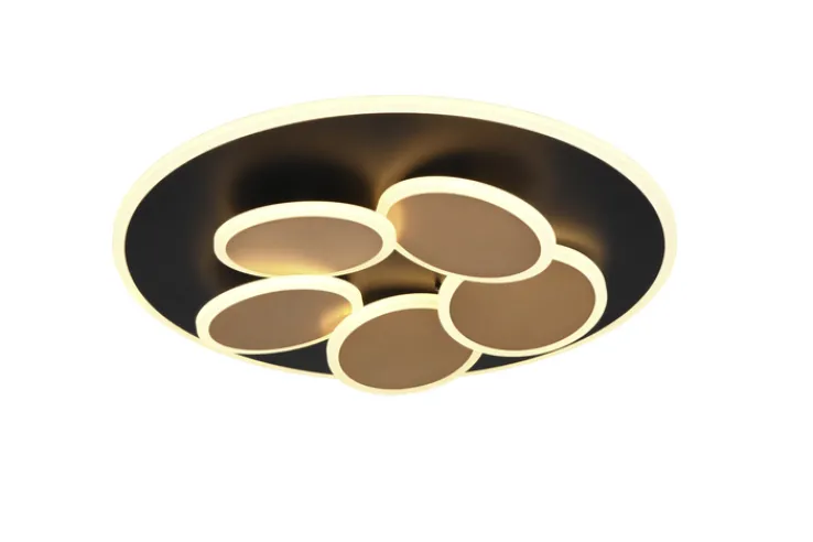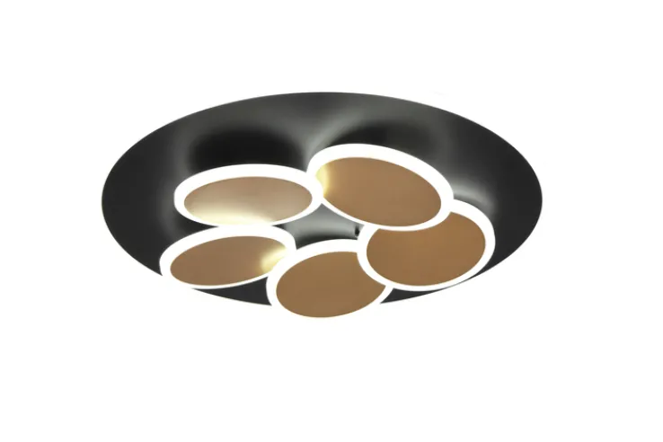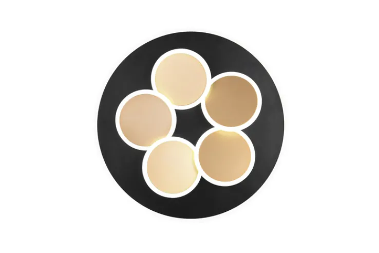 Die schwarz- und goldfarbige LED Deckenlampe MANDALA hat einen Durchmesser von 49 cm. Sie ist aus Metall sowie Kunststoff gefertigt und wahlweise für eine Montage an der Decke oder der Wand vorgesehen.
