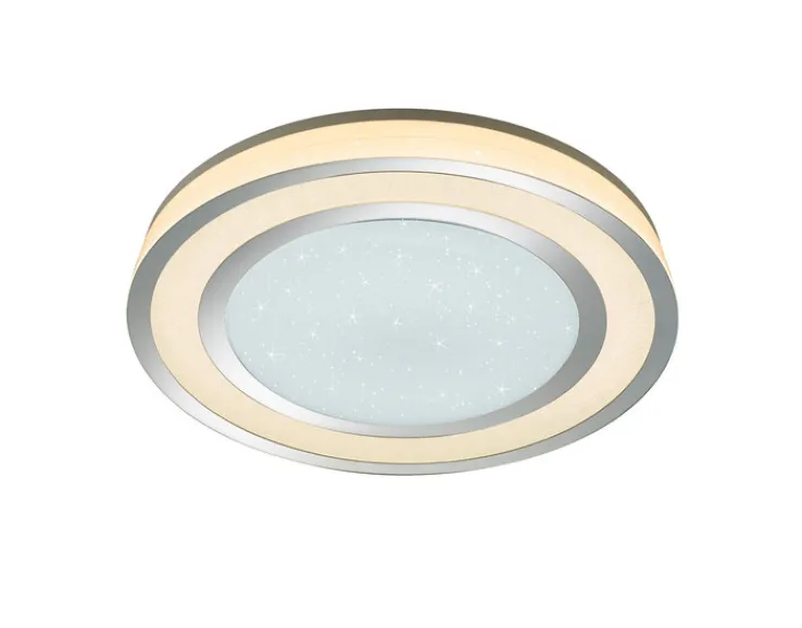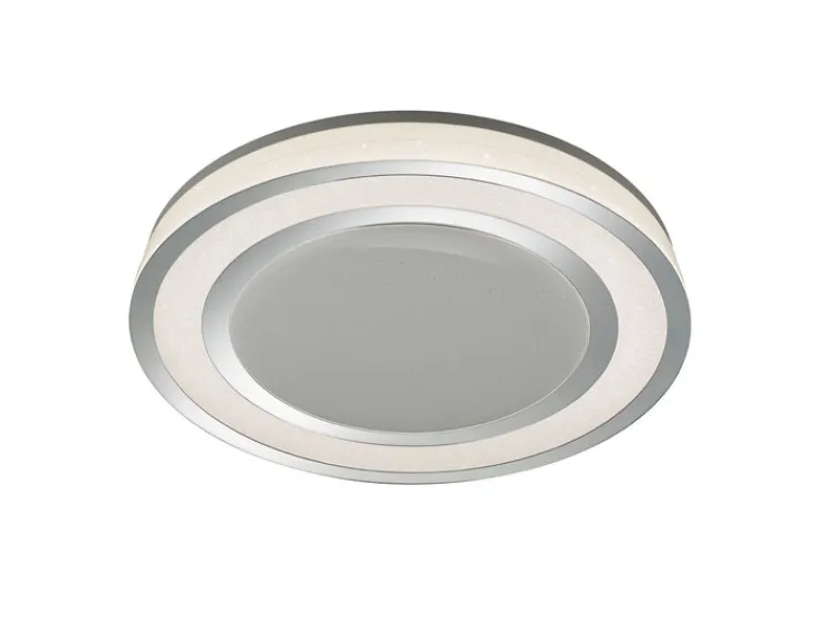 Die Deckenlampe besteht aus hochwertigem Kunststoff und hat eine kreisrunde, sehr flache Form. Die Kombination aus chromfarbigen und weißen Elementen verleiht ihr eine moderne Note und sorgt dafür, dass sie an einer weißen Decke kaum auffällt. Die 1-flammige Lampe enthält ein energiesparendes LED-Leuchtmittel. Das bringt eine Lichtleistung von 4750 lm und eine Farbtemperatur von 5500 K mit sich. Außerdem brennt es bis zu 30.000 Stunden. Die Lampe ist dimmbar und lässt sich ganz bequem per Fernsteuerung bedienen.
