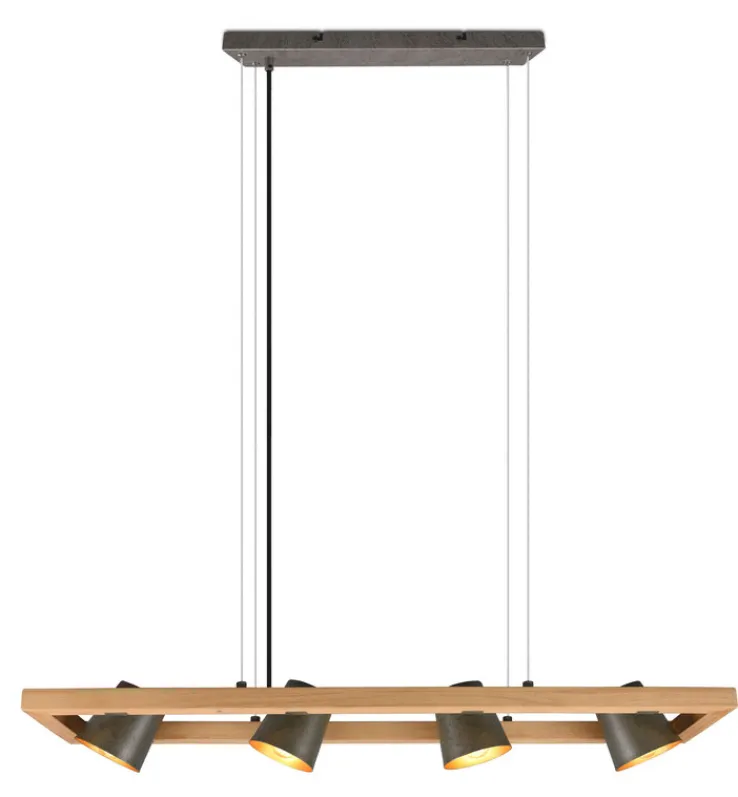Über Bar oder Esstisch verbreitet die TRIO Pendellampe BELL mit ihrem originellen Vintage-Look im Nu eine gemütliche Atmosphäre. Die vier einzelnen Spots lassen sich individuell verstellen und so an die Erfordernisse der Räumlichkeiten anpassen. Der braune Holzrahmen und die alu- und goldfarbigen Schirme passen besonders gut in Einrichtungen im Landhaus- oder Industrial-Stil.