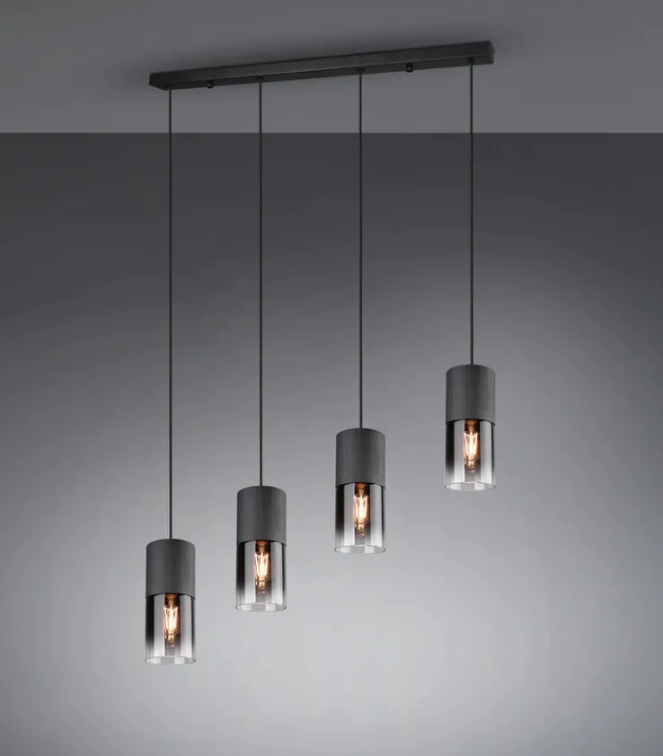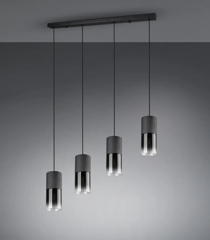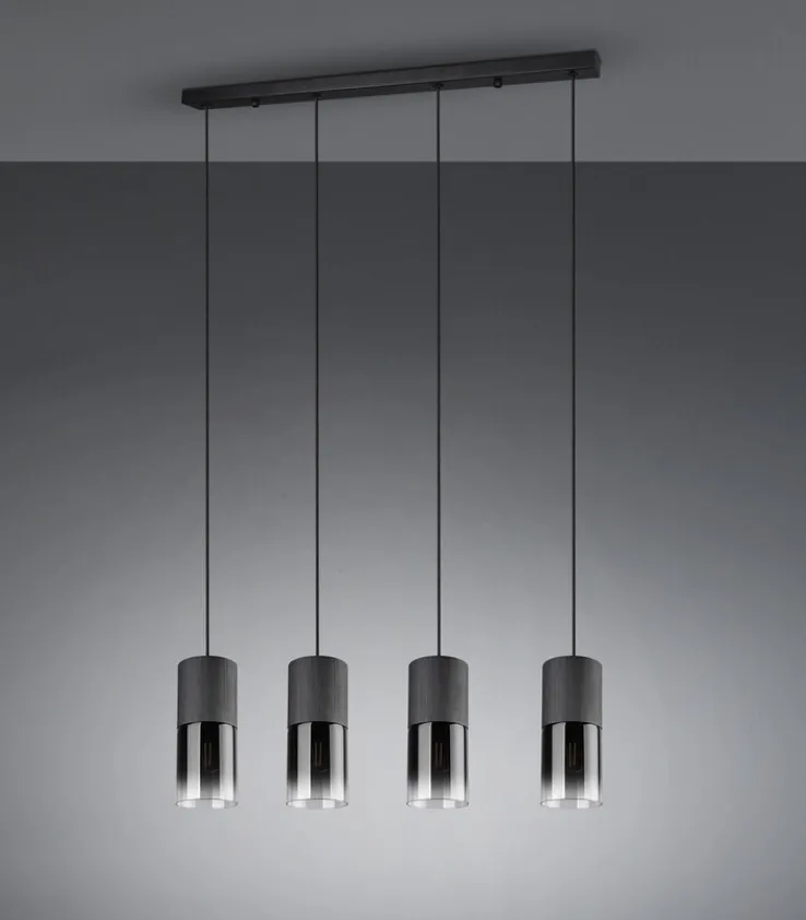 Mit der stilvoll anmutenden Kombination aus schwarzem Metall und rauchfarbigem Glas präsentiert sich die etwa 80.5 cm x 10 cm x 150 cm große LED Pendellampe ROBIN als modernes Wohnaccessoire aus dem Hause TRIO.