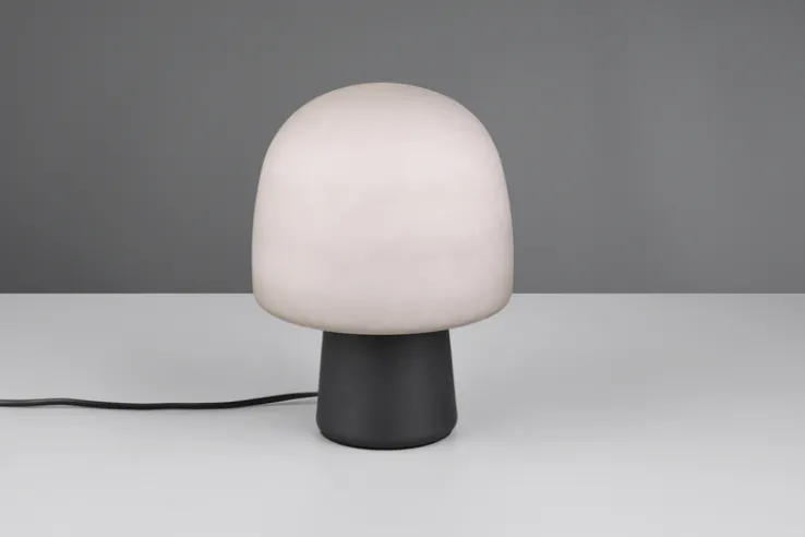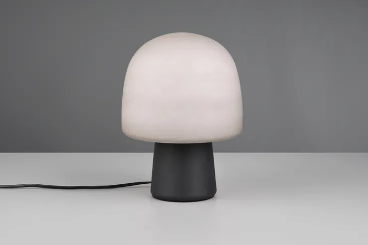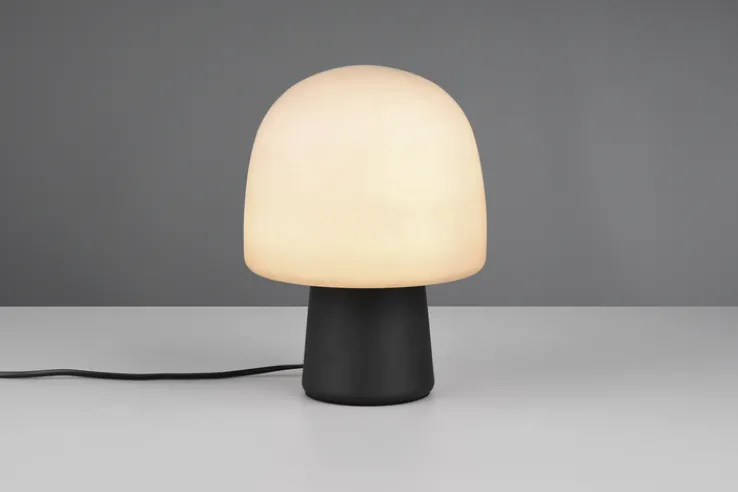 Wer eine Tischlampe mit besonderem Design und erstklassiger Qualität sucht, findet mit dem 27 cm hohem, schwarzem Retrofit-Model STEEN von TRIO aus Metall und Glas genau das Passende. Schirm und Korpus ergeben ein pilzförmiges Design, das an die 70er Jahre erinnert, aber aufgrund der Material- sowie Farbkombination sehr modern und schick wirkt.