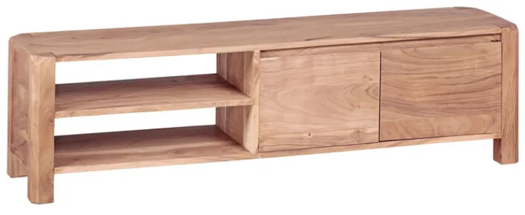 Das elegante TV-Lowboard hat die Maße 140 x 40 cm und verbindet gelungenes Design mit nützlicher Funktionalität. Durch den Korpus, die Fronten und die Füße aus fein gemasertem Akazienholz, fällt das 1-türige Lowboard sofort ins Auge und ist vielseitig mit verschiedenen Wohnzimmermöbeln kombinierbar. Zwei offene Fächer bieten Platz für moderne Unterhaltungselektronik. Zusätzlicher Stauraum für Bücher oder Kleinteile steht in einem großen Schubkasten und hinter einer Drehtür zur Verfügung. Das TV-Lowboard ist ideal für eine gemütliche Einrichtung.