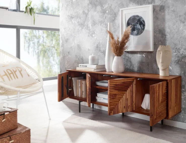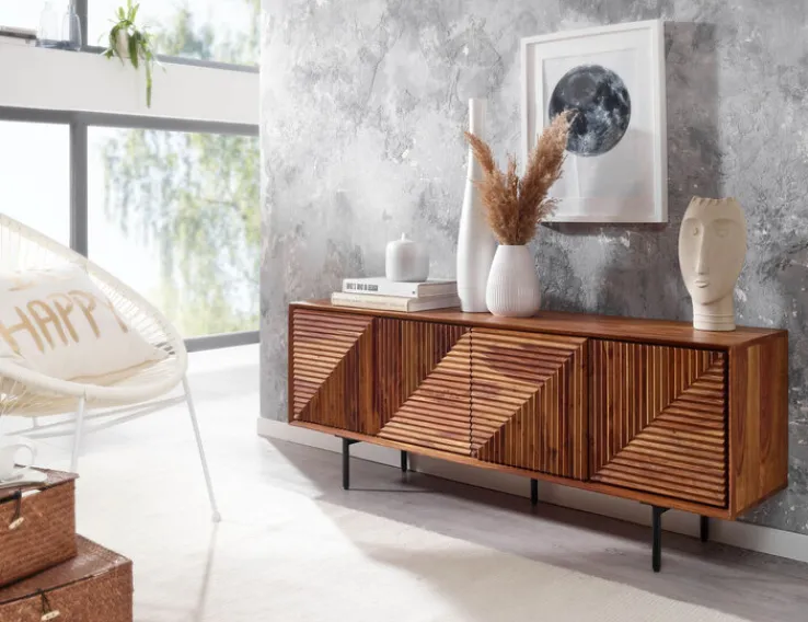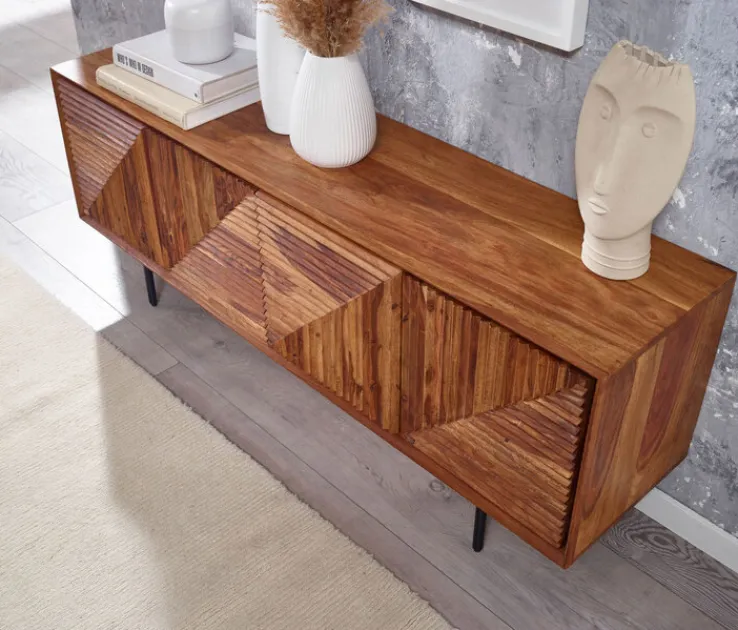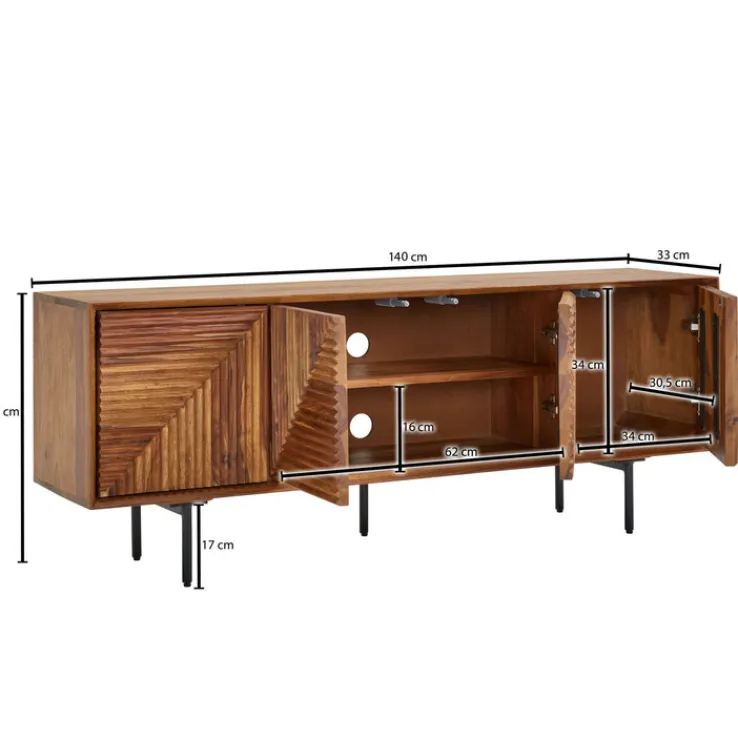 Das moderne TV-Lowboard besteht aus gebeiztem, lackiertem Sheesham Massivholz und matt schwarz lackierten Füßen aus Metall. Es wird in Indien gefertigt und lässt sich mit einem Gewicht von maximal 60 kg belasten. Einem großen Fernseher steht somit nichts mehr im Weg. Hinter den vier Türen mit spannender 3D-Optik wartet das TV-Lowboard mit umfangreichem Stauraum auf. Die Oberfläche bietet neben einem Fernseher auch Platz für Dekorationen.