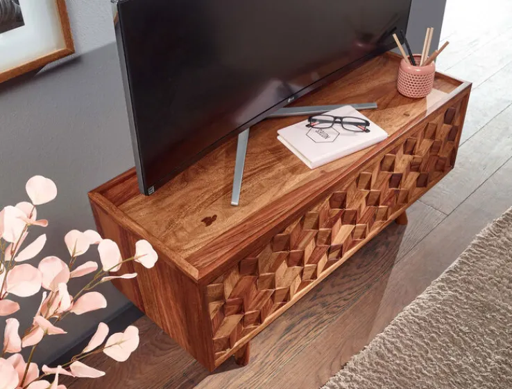 Das TV-Lowboard aus Sheesham Massiv-Holz hat eine Größe von 92 x 44 cm. Es zieht mit seiner spannenden Front alle Blicke auf sich und weiß zudem mit seinem Stauraum zu überzeugen.