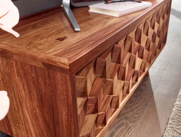 Das TV-Lowboard besteht zur Gänze aus gebeiztem und lackiertem Sheeshamholz. Es stammt aus Indien und ist mit seiner außergewöhnlichen 3D-Front der Eyecatcher im Wohnzimmer. Hinter der großen Klappe verbirgt sich jede Menge Stauraum für DVDs und vieles mehr. Hergestellt aus massivem Holz ist das TV-Lowboard sehr robust und lässt sich mit einem Gewicht von maximal 50 kg belasten. Zudem bietet die Oberfläche ausreichend Platz für einen großen Flachbildfernseher.