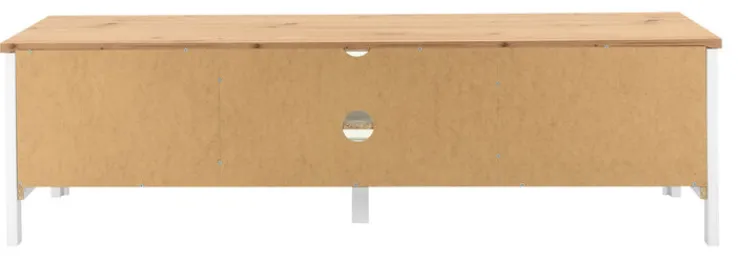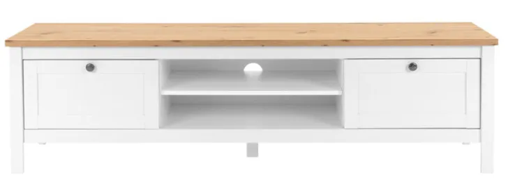 Das TV-Lowboard BERGEN kombiniert einen Korpus in mattem Weiß mit einer Deckplatte in Eichenfarbe. Mit seiner Kombination aus Weiß und Artisan Eiche wirkt das Lowboard im Landhausstil elegant und natürlich zugleich. Unterstrichen wird das stilvolle Design von Fronten in Kassettenoptik und Kugelgriffen im Antiklook. Neben dem ansprechenden Design bietet das TV-Board viel Platz für Audio- und Videozubehör. Die offenen Gerätefächer sind mit einem Kabeldurchlass ausgestattet, der Kabel dezent durch die Rückwand leitet.
