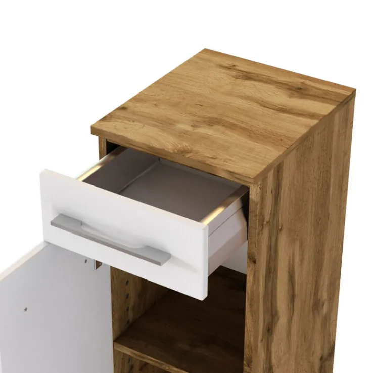 Der Unterschrank LIVORNO in der Farbkombination Wotan Eiche/ Weiß Matt benötigt eine Stellfläche von 30 x 64 cm. Mit seinem modernen Look schenkt er dem Badezimmer ein einladendes Ambiente mit natürlichem Flair.