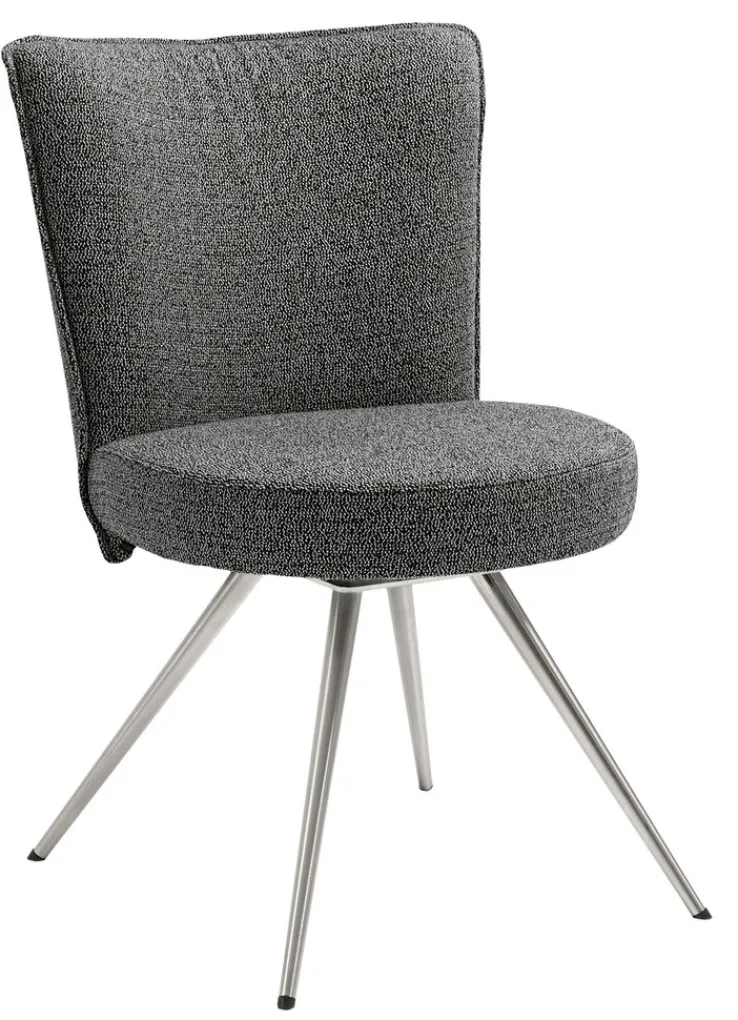 Das Untergestell und die Füße des Esszimmerstuhls sind aus Edelstahl gefertigt. Die glatten Oberflächen des soliden Spinngestells sind poliert. Die Sitzfläche und die Rückenlehne sind weich mit Schaumstoff gepolstert. Der strapazierfähige Bezug aus Textil ist aufwendig vernäht.