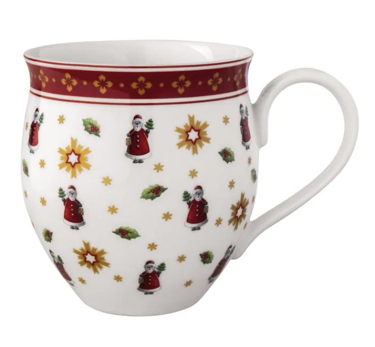 Das Becher-Set aus der Serie TOY’S DELIGHT von Villeroy & Boch besteht aus vier bauchigen Bechern mit einer Höhe von 10,1 cm und einem Fassungsvermögen von jeweils 390 ml. Die Becher sind aus hochwertigem Bone China gefertigt, was ihnen eine feine und zugleich robuste Beschaffenheit verleiht. Die Hauptfarbe ist Weiß, ergänzt durch ein mehrfarbiges Dekor, das auf jedem Becher unterschiedliche weihnachtliche Motive wie Spielzeuglokomotiven, Nussknacker, Schaukelpferde und Figuren zeigt. Ein durchgehender roter Rand mit goldfarbenen Ziermustern verleiht den Bechern eine festliche Optik. Das Set ist für vier Personen geeignet und bietet sich besonders für den Einsatz in der Küche an. Die Oberfläche ist glatt, das Design wirkt detailreich und traditionell mit klaren, kontrastreichen Farben.