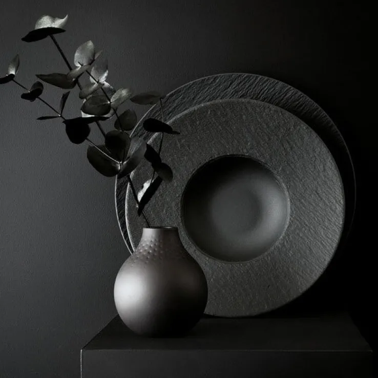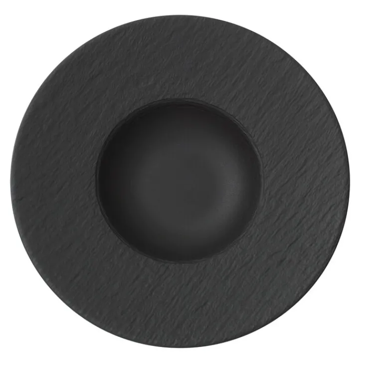Dieser ausgefallene, tiefe Teller MANUFACTURE ROCK in der Farbe Schwarzgrau/Schieferstruktur ist aus hochwertigem Premium Porzellan, etwa neunundzwanzig Zentimeter groß und der ideale Pasta, Nudeln und Co.