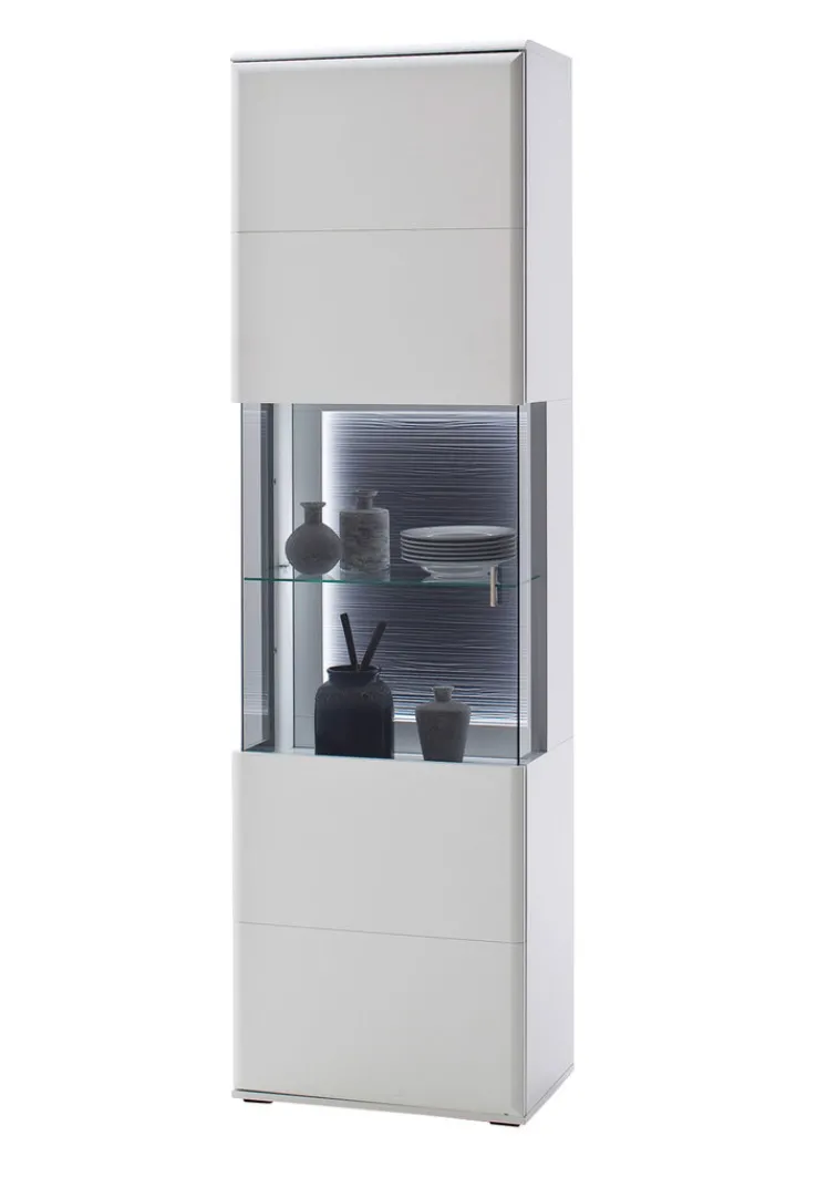 Die elegante Vitrine AMORA mit einer Breite von etwa 60 cm präsentiert sich in einem stilvollen und trendigen Design. In modern eingerichteten Wohnräumen fällt die weißfarbige Vitrine aus einer Holznachbildung mit einem Glaseinsatz und einer 3-D-Rückwand im Farbton anthrazit sofort ins Auge. Auf den Glasböden ist viel Platz für Vasen, Gläser, Bilder und Lieblingsstücke. Zusätzlicher Stauraum steht hinter der großen Drehtür auf zwei stabilen Fachböden zur Verfügung.