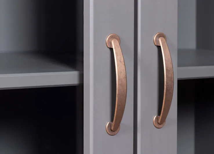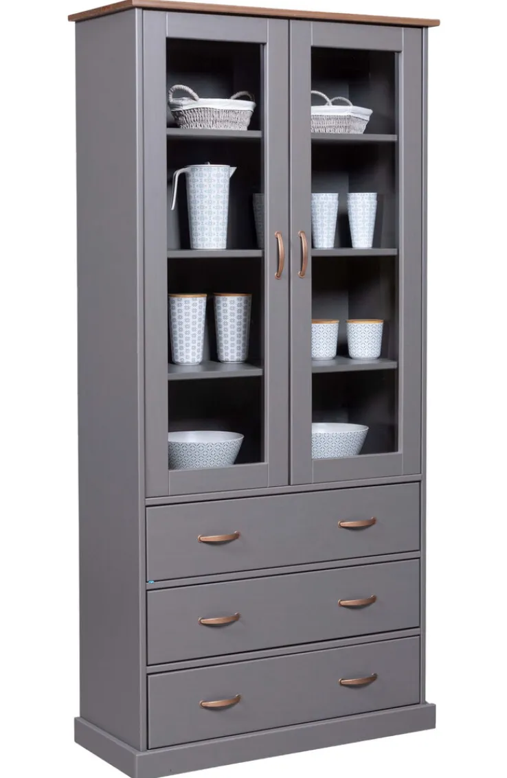 Die Vitrine NICLAS kombiniert das moderne Grau mit kupferfarbigen Griffen und einer in Kupferfarbe abgesetzten Deckplatte. Mit dieser attraktiven Farbkombination zieht das Möbelstück alle Blicke auf sich. Ein Highlight ist die Vitrine allerdings nicht nur optisch! Hinter ihren Glastüren bietet sie auf vier Ebenen ausreichend Platz für das schönste Porzellan und elegante Gläser. In den drei breiten Schubkästen bietet der Vitrinenschrank weiteren Stauraum für Servietten, Besteck und vieles mehr.