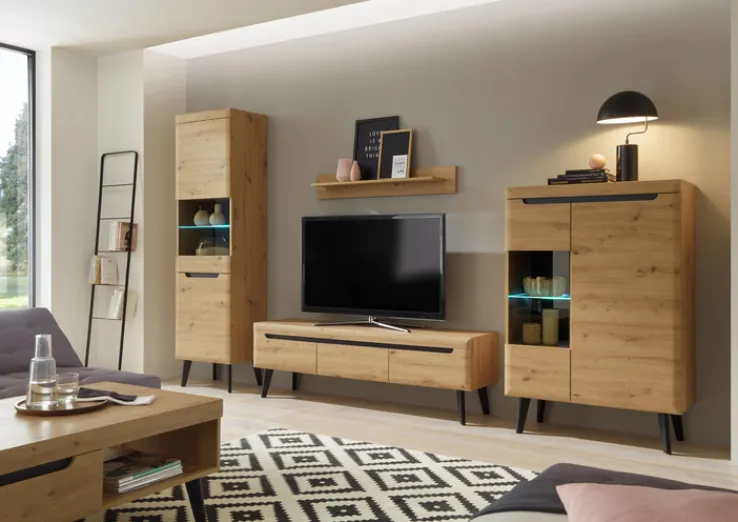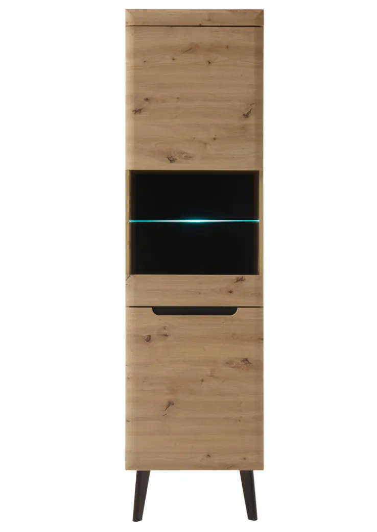 Die Vitrine aus der Serie TORGE besticht durch ihr modernes Design und die Kombination aus Holznachbildung und Glas. Mit einer Breite von 53 cm, einer Höhe von 197 cm und einer Tiefe von 40 cm bietet sie ausreichend Stauraum und passt sich ideal in verschiedene Wohnräume ein. Die Hauptfarbe ist Braun, ergänzt durch schwarze Applikationen, die dem Möbelstück einen eleganten Touch verleihen. Die Dekorfarbe in Artisan Eiche unterstreicht den natürlichen Look.