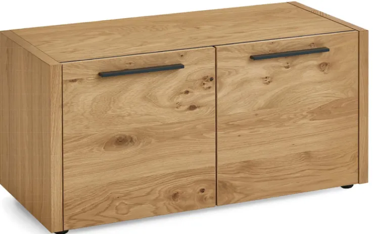 Die Garderobenbank LEVIO besteht aus Metall und furniertem Holz. Verwendet wurde robuste Eiche. Die begeistert nicht nur mit einer hohen Stabilität, sondern auch mit einer warmen Farbgebung und einer sehr natürlichen Maserung. Die Front der Garderobenbank unterteilt sich in zwei Drehtüren. Dahinter befindet sich ein Holzeinlegeboden, der optional verstellbar ist. So können Sie in der Bank Ihre Schuhe unterbringen. Außerdem können Sie sich beim Anziehen der Schuhe einfach auf die Bank setzen. Dank ihres natürlichen und dennoch sehr geradlinigen Designs passt die Garderobenbank LEVIO in zahlreiche Wohnkonzepte.