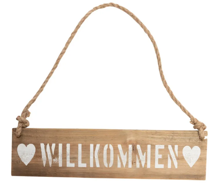 Das Schild besteht aus massivem Holz und ist auf den Oberflächen und den Kanten geschliffen. Der Willkommensgruß und die Herzen auf der Front des Schilds sind in der Farbe weiß lackiert. Zum Aufhängen ist die Wanddeko mit einem naturbelassenen Seil ausgestattet.