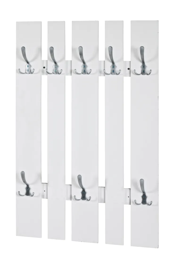 Diese Wandgarderobe misst 65 x 100 x 9 cm und besteht aus einer Holznachbildung in Weiß. Sie ist mit acht silberfarbigen Haken aus Stahl versehen.