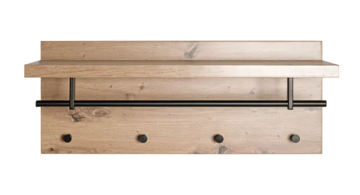 Vier stabile Kleiderhaken und eine durchgehende Kleiderstange ermöglichen das ordentliche Aufhängen von Garderobe. Eine durchgehende Hutablage ergänzt die Konstruktion. Gefertigt ist die PARMA5 aus robusten, beschichteten und lackierten MDF-Platten. Die Kleiderstange und die Garderobenhaken aus hochwertig lackiertem Metall sorgen nicht nur für Stabilität, sondern setzen auch einen modernen, industriellen Akzent.