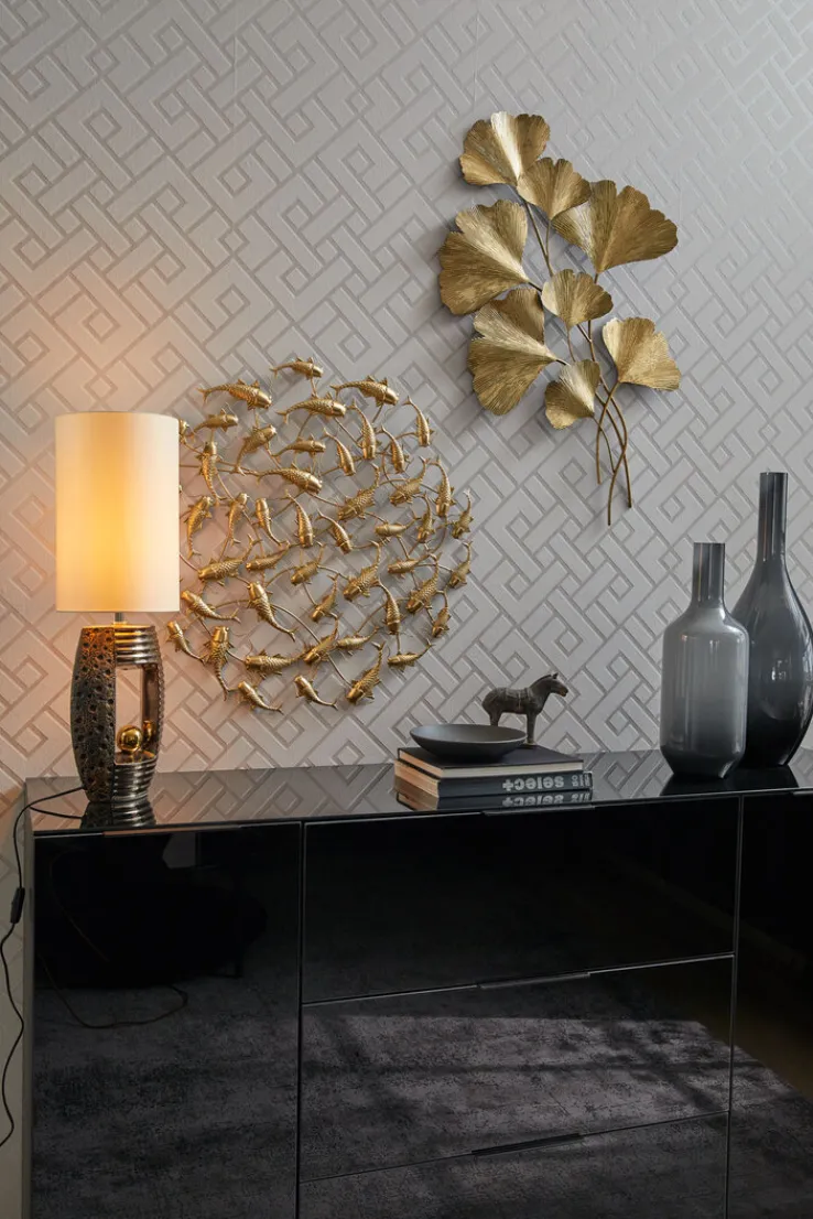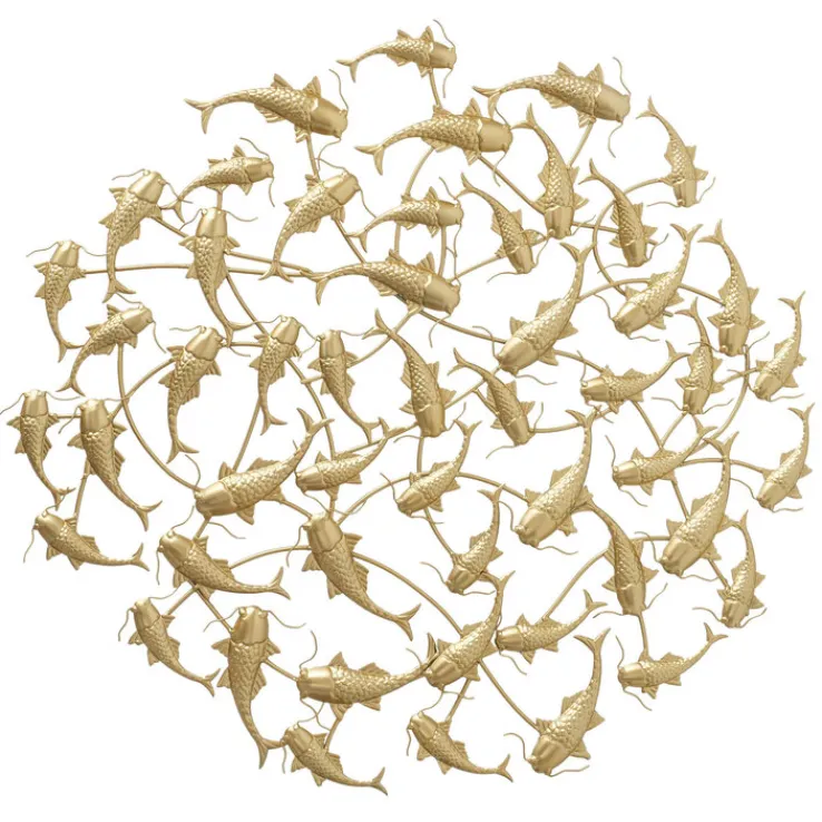 Zu einer Bereicherung für jedes Heim wird das dekorative Wandobjekt MAZU FISCH. Es setzt einen tollen maritimen Akzent, wirkt durch den goldenen Farbton zugleich magisch schillernd. Das Objekt, das zahlreiche miteinander verbundene Fische zeigt, besteht aus pulverbeschichtetem Metall und beeindruckt mit seinem Durchmesser von 82 cm.