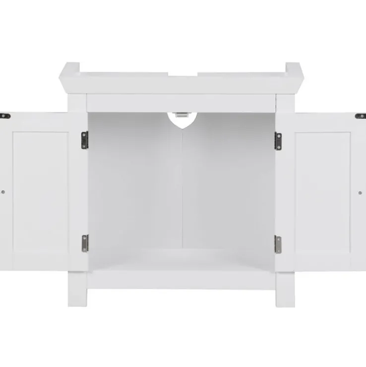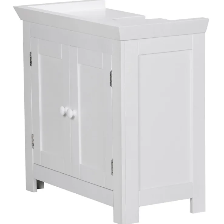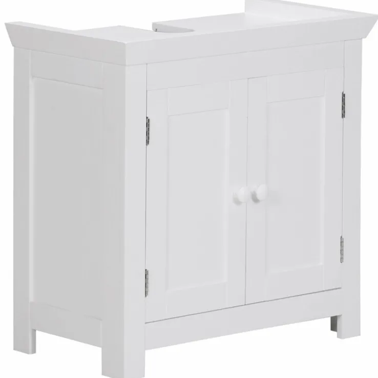Der Waschbeckenunterschrank besteht aus hochwertiger Holznachbildung und lässt sich mit einem Gewicht von maximal 10 kg belasten. Schlichte Kugelgriffe perfektionieren den weißen Landhauslook. Der Unterschrank bietet nicht nur eine Aussparung, in der sich das Waschbecken einbetten lässt, er ist zudem mit einem 7,5 x 13 cm großen Siphonausschnitt versehen. Hinter den zwei Türen bietet der Waschbeckenunterschrank ein geräumiges Fach in dem auch Waschmittelboxen Platz finden.