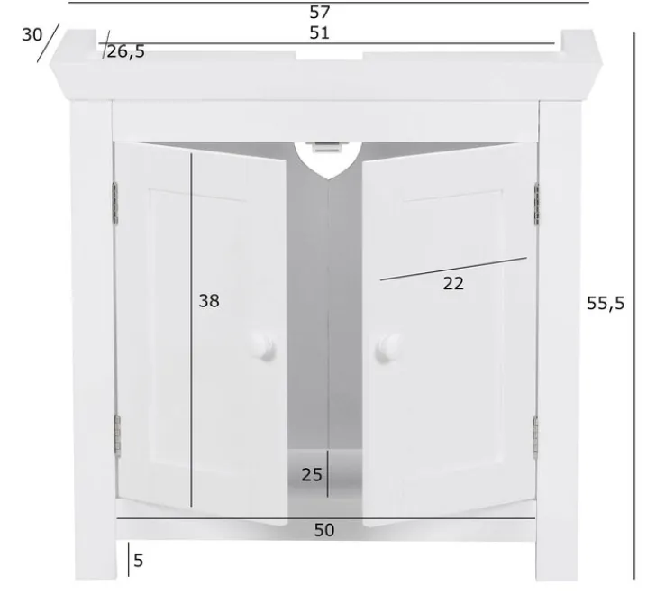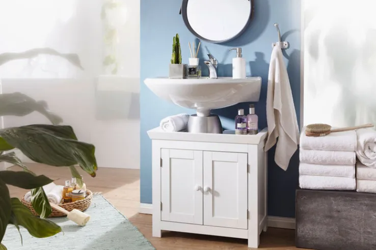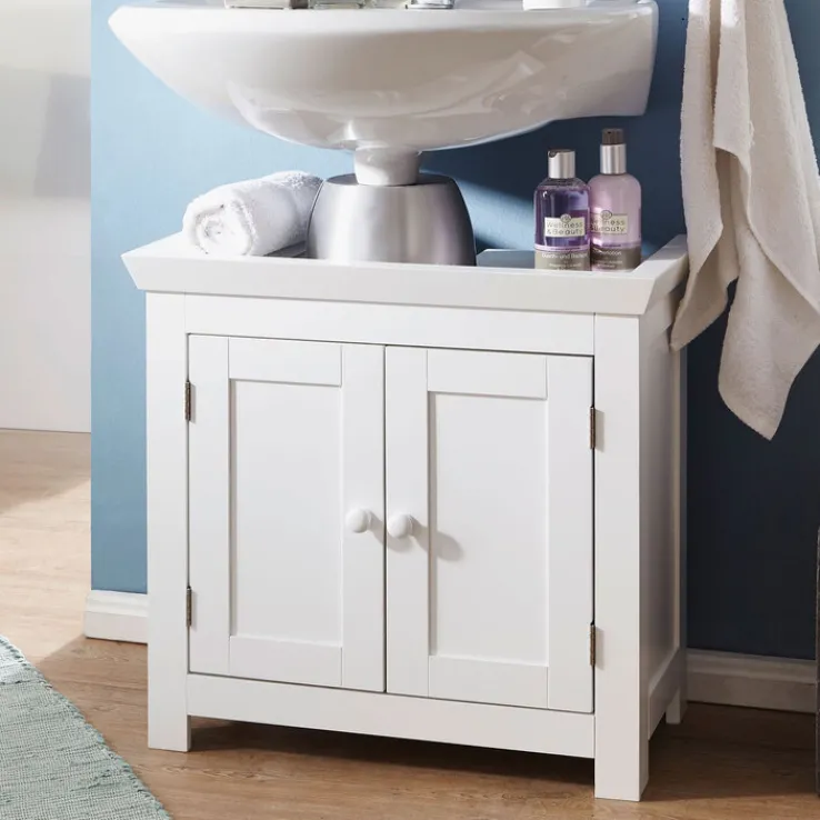 Der weiße Waschbeckenunterschrank mit den Maßen 57 x 56 cm besticht auf den ersten Blick mit einem stilvollen Design im modernen Landhausstil. Zudem bietet er viel Stauraum für Reinigungszubehör und vieles mehr.