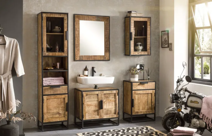 Der Waschbeckenunterschrank in Natur und Schwarz und mit Maßen von 67 x 62 cm ist ein echter Blickfang im Industrial-Design. Die Elemente aus massivem Mangoholz sorgen für eine edle Optik.