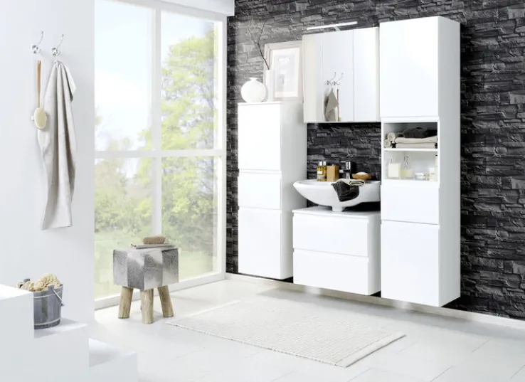 Der Waschbeckenunterschrank CARDIFF in Hochglanz Weiß benötigt eine Stellfläche von 60 x 53 cm. Er überzeugt auf den ersten Blick mit einem schlichten, modernen Look und bietet zudem viel Stauraum für Handtücher und vieles mehr.