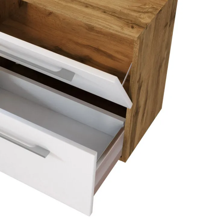 Der Waschbeckenunterschrank LIVORNO in den Maßen 60 x 53 cm ist ein praktischer Helfer in jedem Badezimmer oder wo auch sonst im Haushalt sich ein Waschbecken befindet. Dieser besteht aus einem Gehäuse im Deko-Stil Wotan Eiche, während der eingefügte Schubkasten sowie die Klappe in Weiß matt gehalten sind.