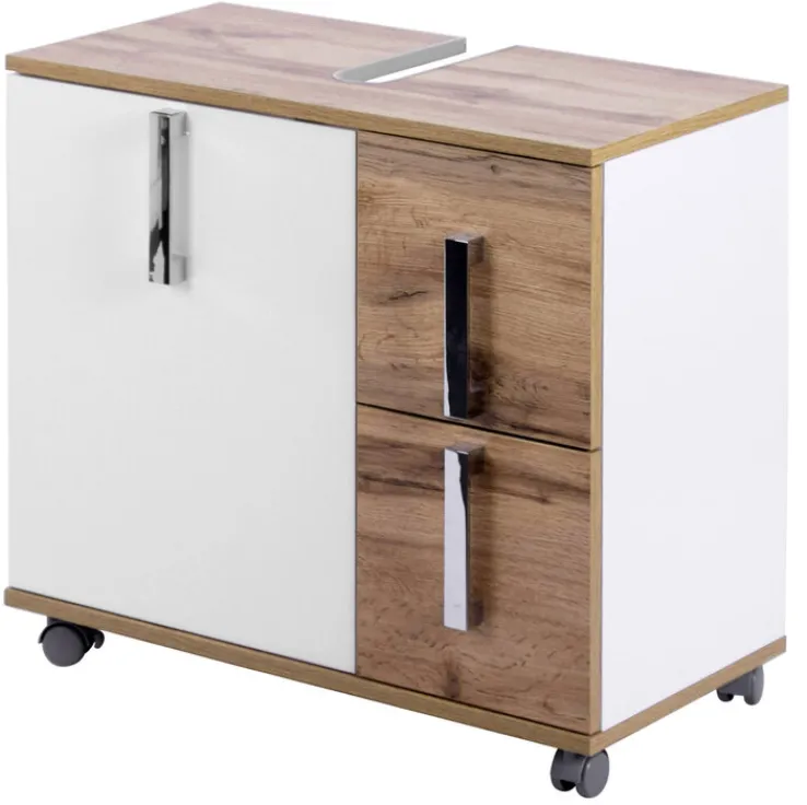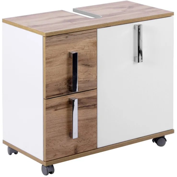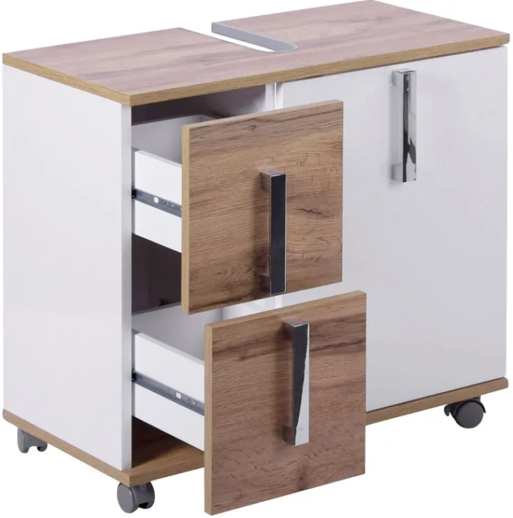 Waschbeckenunterschrank LUCA ist 65 x 60 cm groß und punktet mit einem modernen Design in Weiß / Eiche Landhaus. Die Verarbeitung in Holznachbildung / Melamin ist sehr hochwertig, pflegeleicht und robust.