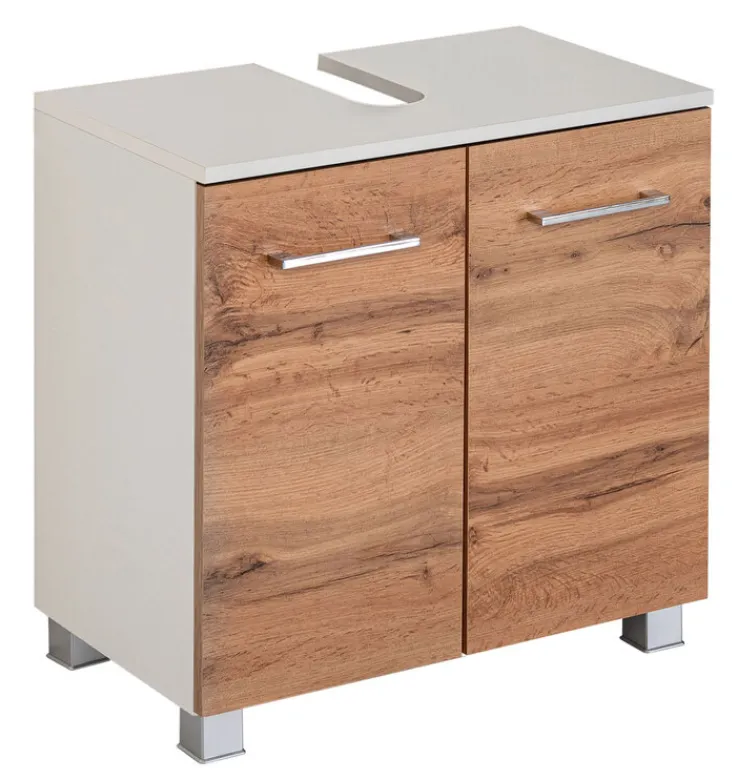 Modern und elegant präsentiert sich der 60 x 53 cm große Waschbeckenunterschrank PARIS in der Farbkombi Weiß / Wotan Eiche. Er kann hängend oder stehend montiert werden und ist 35 cm tief.