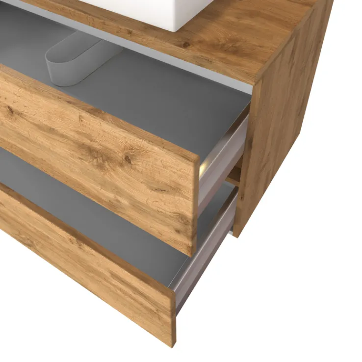 Der Waschtisch BREGENZ kommt inklusive einem rechteckigen Aufsatzbecken 43,5 × 62 cm. Dieses ist aus Keramik gefertigt und hat eine Randhöhe von 9 cm. Der Korpus ist aus Spanplatte gefertigt. Die Holznachbildung (Wotaneiche) ist auf eine Folierung zurückzuführen. Die beiden Schubkästen kommen ohne klassischen Griffe aus. Über Vollauszüge aus Metall fahren sie ein und aus. Das erfolgt leise per Soft-Close. Hier lassen sich Handtücher, Kosmetik und schwerere Badutensilien unterbringen.