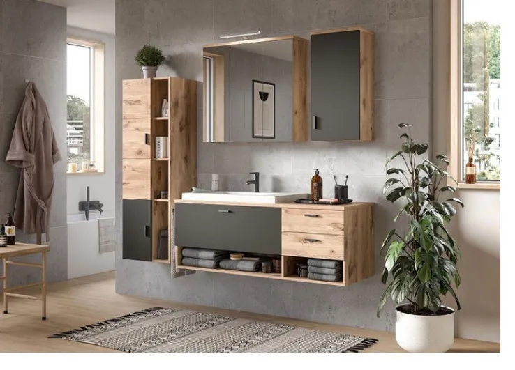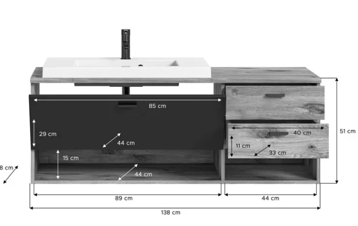Der Waschtisch GRADO in Eiche/Grau ist 51 cm hoch, 138 cm breit und 48 cm tief. Er verfügt über einen Stauraum mit Klappe, zwei Schubkästen nehmen kleinere Gegenstände auf.