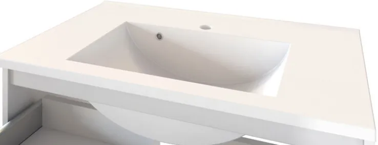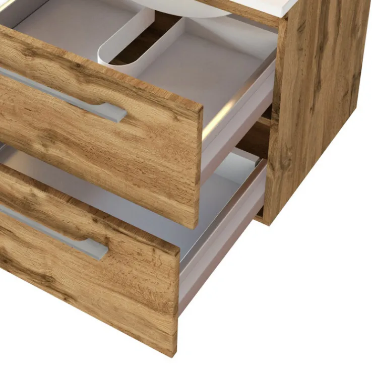 Dieser hängend zu montierende Waschtisch ist dank seiner Form sowie seiner farblichen Kontraste ein echter Hingucker in jedem Badezimmer. Er hat eine Tiefe von 47 cm und ist mit Metallgriffen ausgestattet, wodurch er schnell und einfach auf- beziehungsweise zugemacht werden kann. Damit Letzteres leise vonstatten geht, verfügt er außerdem über eine Soft-Close-Funktion. Der Waschtisch kommt inklusive eines Mineralgusswaschbeckens, zwei Schubkästen sowie einem Siphonausschnitt; ein passender Siphon kann separat dazu bestellt werden.