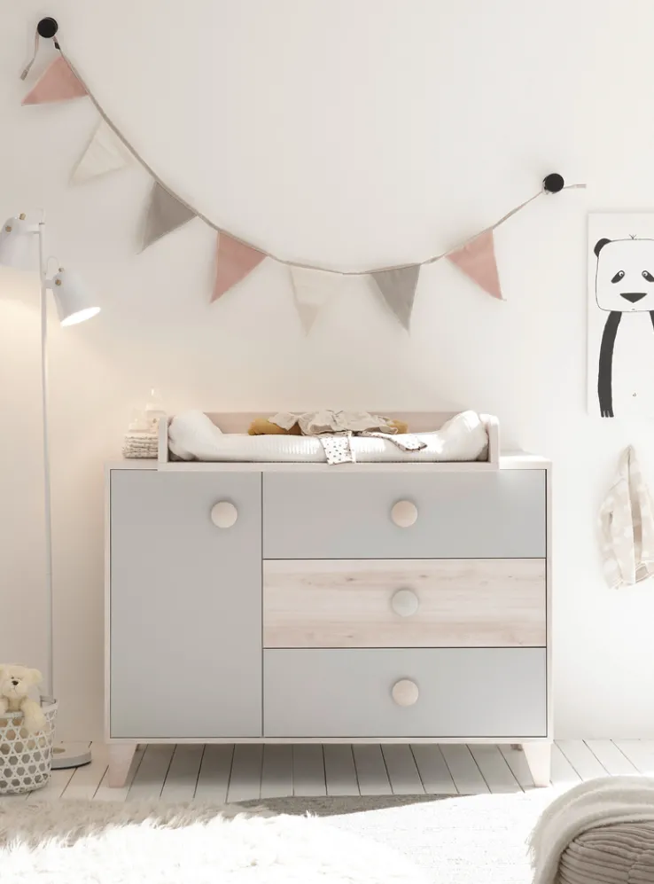 Das klassische Kommodendesign mit Schubladen und Drehtüren besticht durch einen frischen, jungen und freundlichen Stil. Dazu tragen vor allem die hellen Farben und die großen Griffknöpfe bei, die auch von Kinderhänden leicht zu bedienen sind. Die Wickelkommode FIEN hat die Maße 120 x 100 x 78 cm in Breite, Höhe und Tiefe. Die Oberfläche der Kommode hat durch die Holznachbildung eine feine Struktur und ist sehr pflegeleicht. Der Stauraum sorgt dafür, dass vom Feuchttuch bis zum Strampler alles griffbereit ist.