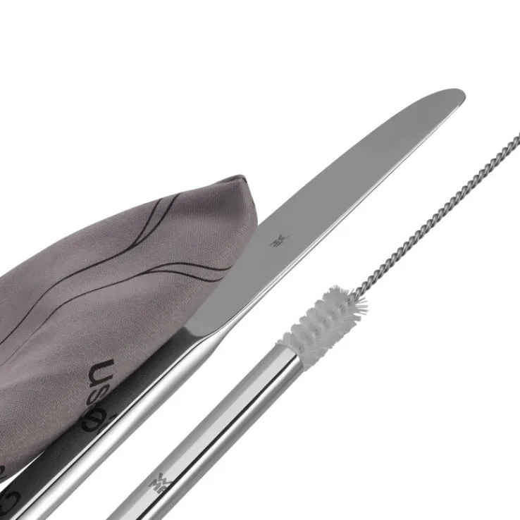 Unterwegs bestens ausgestattet sind Sie mit diesem To-Go Besteckset aus dem Hause WMF. Neben einer Gabel, einem Messer und einem Löffel beinhaltet das Ensemble aus rostfreiem Cromargan einen Strohhalm mit passender Reinigungsbürste. Alle Teile der Serie finden in dem eleganten Etui in grauer Filzoptik Platz. Einzelne Einstecktaschen halten das Besteck an Ort und Stelle und verhindern störende Klappergeräusche.