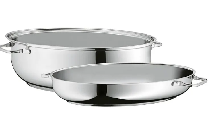 Mit einer Länge von 41 cm, einer Breite von 28 cm und einer Höhe von 18,5 cm ist der oval geformte Extrabräter ideal für das Anbraten und Schmoren großer Fleischportionen, wie einem Rinderbraten oder einer Weihnachtsgans geeignet. Der Metalldeckel lässt sich auch als praktische Edelstahl-Pfanne oder als backofenfeste Auflaufform verwenden, sodass Sie mit dem Extrabräter von WMF ein multifunktionales Kochgeschirr erhalten. Der rostfreie Cromargan Edelstahl 18/10 ist geschmacksneutral und säurefest und kann leicht in der Spülmaschine gereinigt werden.