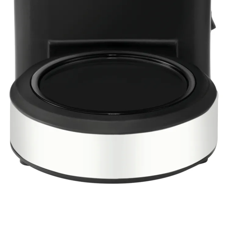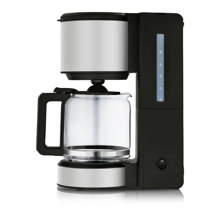 Die Kaffeemaschine aus der Serie STELIO PAPER präsentiert sich in einer klaren, modernen Form mit silberfarbenen und schwarzen Elementen. Die Kombination aus Glas, Kunststoff und Metall verleiht dem Gerät eine schlichte Optik, wobei die Glaskanne durch ihre Transparenz einen guten Überblick über den Füllstand bietet. Der Wasserstandsanzeiger an der Seite ist deutlich sichtbar und mit einer Skala bis zu 10 Tassen versehen.