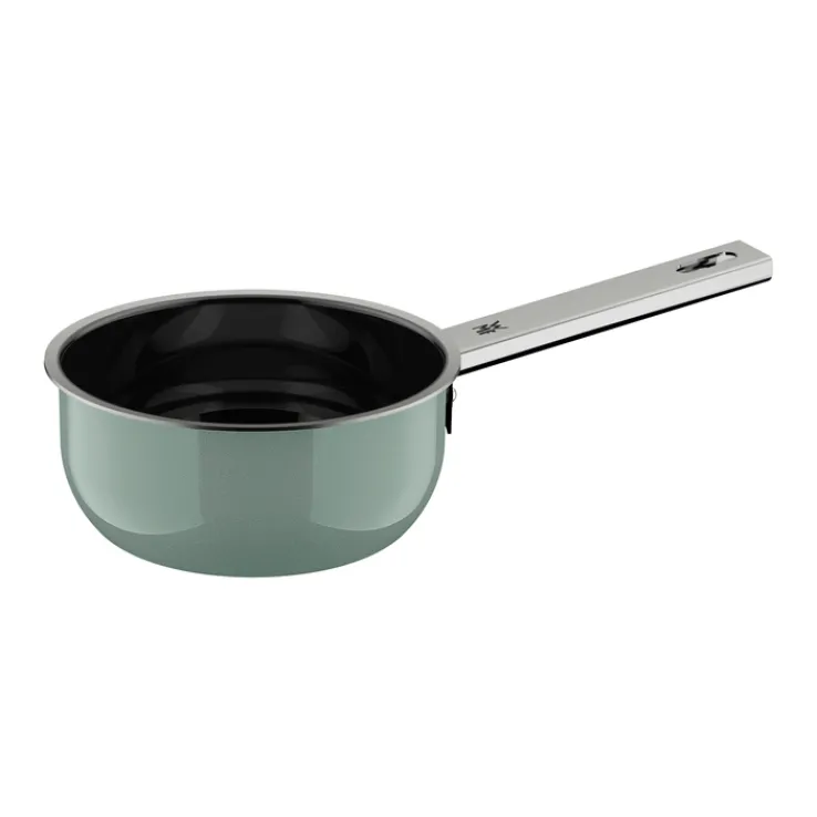 Das siebenteilige Topfset der Serie FUSIONTEC MINERAL PRO von WMF überzeugt durch eine einheitliche grüne Farbgebung im Farbton Eucalyptus Haze und eine moderne, runde Form. Das Set besteht aus drei unterschiedlich großen Kochtöpfen mit passenden Deckeln sowie einem Stieltopf. Die äußere Oberfläche zeigt ein glattes, glänzendes Finish, während die Deckel aus transparentem Glas gefertigt sind und über stabile Griffe verfügen. Die Griffe und Ränder sind aus glänzendem Metall gehalten, was dem Set einen zeitlosen, hochwertigen Charakter verleiht.