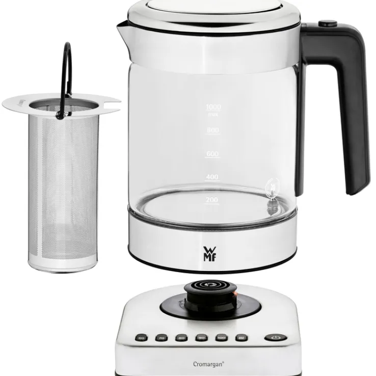 Der WMF Wasserkocher VARIO aus der Serie KÜCHENMINIS hat eine moderne Optik und ist ideal zur variablen Zubereitung von Wasser. Beim Erreichen von 60 °C, 70 °C, 80 °C, 90 °C und 100 °C ertönt ein akustisches Signal. Dadurch hat das Wasser für den Tee immer die gewünschte Temperatur. Der hochwertige Glasbehälter ist mit einem herausnehmbaren Behälter für offenen Tee und einem Kalkfilter ausgestattet. Der Gerätesockel hält das erwärmte Wasser bis zu 20 Minuten auf Temperatur.